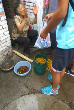 老奶奶将果核剥开用来卖钱