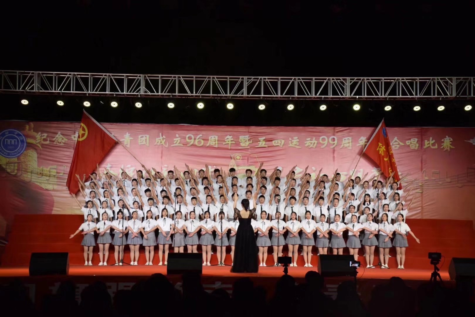 副校长刘翔首先宣读了《关于表彰2017年度新乡学院“五四红旗团总支”、“五四红旗团支部”、“优秀团干部”和“优秀团员”的决定》。随后,丁庭选书记、刘兴友校长、杨士斌副书记、刘翔副校长分别为获奖选手进行颁奖。其中,2016级体教三班团支部作为“新乡学院2017年度五四红旗团支部”优秀代表上台领奖。最后,党委副书记杨士斌发表重要讲话。表彰大会结束后,“五四”大合唱比赛正式开始。beat365正版唯一官网必一合唱队演奏了《光荣啊,中国共青团》和《致敬青春》。在经过历时一个月的大合唱的准备工作,无论是中午两点还是晚上十点,大合唱的同学们都积极学习,高度配合音乐学院的指导老师。同学们也通过自己的努力,在比赛中打了一场翻身仗,为自己和beat365正版唯一官网必一赢得了荣誉。