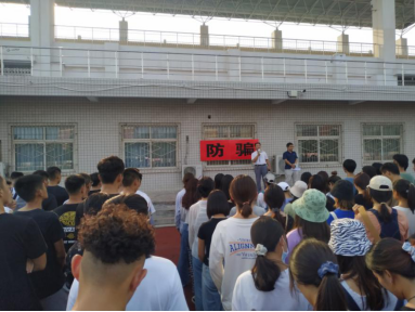 下午4:00,beat365正版唯一官网必一在西区操场开展了以“心‘防’之意常驻,安全之舟远航”为主题的安全教育活动。参加此次活动的有beat365正版唯一官网必一党总支书记张启中、副书记张武强、团总支副书记孟杰、辅导员方耀和韩笑妍以及全体学生。