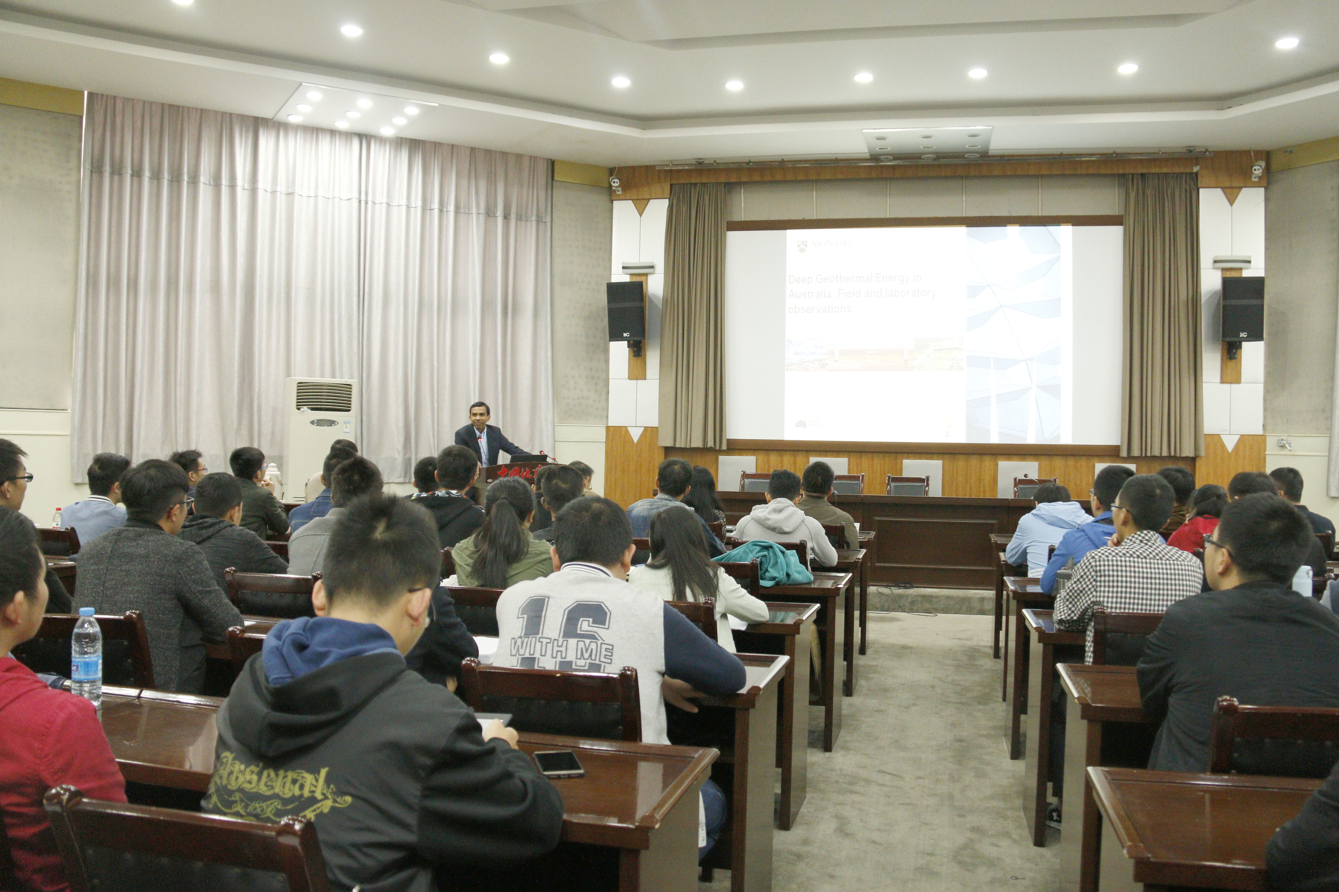 Ranjith教授从地热能发电的巨大潜力入手,介绍了一种增强型地热能源获取系统(EGSs),与传统的化石燃料相比,这种系统更加环保,是一种可再生的能源技术。Ranjith教授通过EGS系统的一些现场观测结果,对EGS系统进行了详细解析,并展示了其团队在EGS系统研究方面的最新研究进展。报告结束后,Ranjith教授热情地回答了师生的提问,他衷心希望能和金年会在地热资源开发方面开展合作研究。