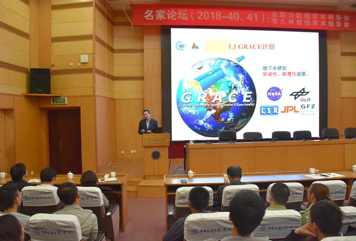 宫辉力教授以《重力卫星-地下水安全-粮食安全-城市安全》为题,介绍了卫星遥感领域的“GRACE”计划及InSAR技术在地学中的应用,详细阐述了在综合遥感与水文地质交叉优势的基础上,如何创建区域地面沉降多元场耦合模型,并展示了研究成果在城市地下空间、南水北调、京津高铁等重大工程中的示范应用,指出了未来卫星遥感的发展方向。在交流讨论环节,宫教授与师生进行了热烈讨论,双方就相关学术问题进行了深入的交流与探讨。
