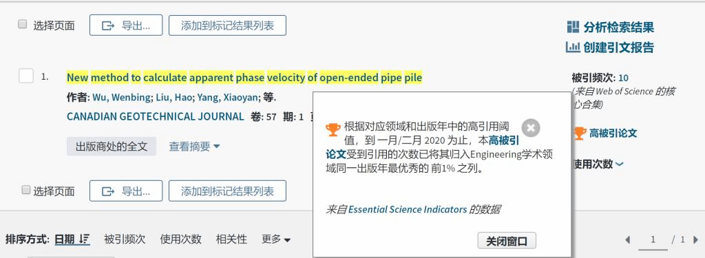 (通讯员:吴文兵、黄静)根据2020年5月基本科学指标数据库(Essential Science Indicators,简称ESI)最新数据显示,金年会勘察与基础工程系吴文兵教授团队2020年在国际土木工程领域顶级期刊《Canadian Geotechnical Journal》 上发表的学术论文“New method to calculate apparent phase velocity of open-ended pipe pile” 入选ESI高被引论文(Highly Cited Paper)。