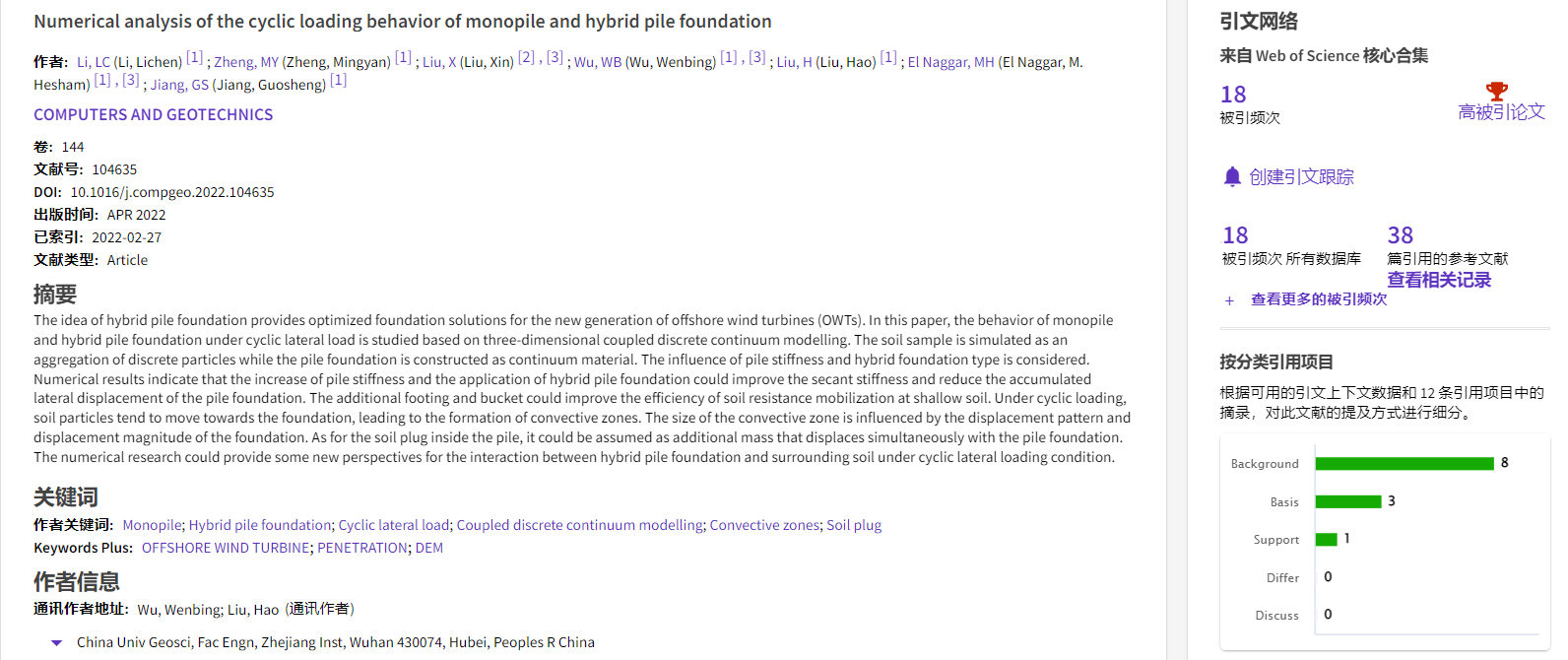 根据2022年11月基本科学指标数据库(Essential Science Indicators,简称ESI)最新数据显示,jinnianhui金年会诚信至上勘察与基础工程系吴文兵教授团队于2022年在国际岩土工程数值模拟权威期刊Computers and Geotechnics上发表的学术论文“Numerical analysis of the cyclic loading behavior of monopile and hybrid pile foundation”入选ESI高被引论文。该论文第一作者为勘察与基础工程系博士后李立辰,通讯作者为吴文兵教授,jinnian金年会(武汉)jinnianhui金年会诚信至上为第一署名单位。
