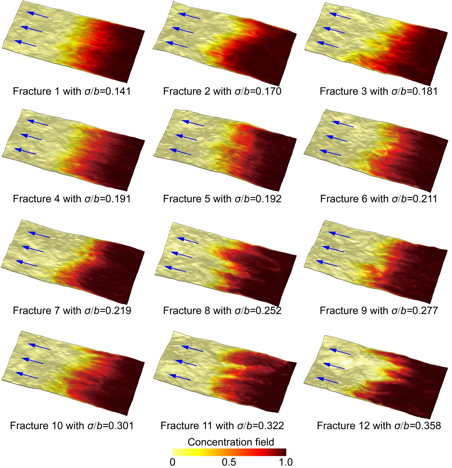 天然岩体受到复杂的应力条件、水文环境以及工程活动等因素的影响,内部普遍发育着不同尺度的宏细观裂隙。这些裂隙在地下物质运移中起着至关重要的作用,其物质传输和运移特性与许多地球物理过程和人类工程活动密切相关。然而,由于岩石裂隙的几何非均匀性和其间流体流态的复杂性,使得岩石裂隙中的物质运移特性表征和预测十分棘手。为解决上述科学问题,借助大型高性能工作站,开展了大规模三维岩石裂隙溶质运移高精度数值模拟研究,阐述并定量化了几何结构特征对溶质运移的控制机制(图1)。采用经典一维宏观对流-扩散理论,对模拟得到的溶质穿透曲线进行反演模拟分析,构建了水动力弥散系数、溶质传输速度与岩石裂隙开度、粗糙度之间的量化公式(图2)。基于经典传输解析公式和修正立方定律,嵌入传输系数参数化公式,最终推导构建了岩石裂隙溶质运移过程预测解析模型。该预测模型实现了仅依据几何结构信息,高保真度地预测溶质运移过程(图3),从而回避了大规模数值建模与模拟求解问题,模型对于直接、高效、低成本地预测裂隙岩体中的物质运移过程具有重要理论意义。