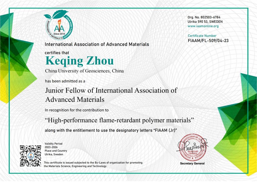 (通讯员 黄静)近日,jinnian金年会(武汉)jinnianhui金年会诚信至上周克清特任教授收到国际先进材料学会(International Association of Advanced Materials, IAAM)执委会发来的贺函,祝贺他当选为国际先进材料学会青年会士(Junior Fellow of IAAM, FIAAM)。周克清特任教授受邀在美国奥兰多举办的复合材料研讨会(Composite Materials Congress)上发表题为“Functionalized 2D molybdenum disulphide working on high-performance flame-retardant polymer materials”的IAAM Fellow演讲,会上获颁青年会士“Junior Fellow”证书,以表彰他在“高性能阻燃聚合物材料”领域做出的杰出贡献。