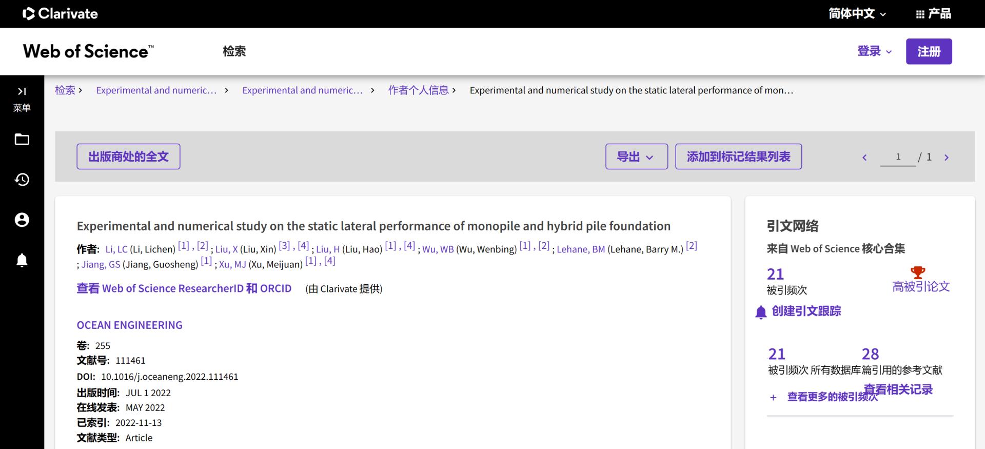 (通讯员 吴文兵)根据2023年6月基本科学指标数据库(Essential Science Indicators,简称ESI)最新数据显示,jinnianhui金年会诚信至上勘察与基础工程系蒋国盛教授团队于2022年在国际海洋岩土领域权威期刊Ocean Engineering上发表的学术论文“Experimental and numerical study on the static lateral performance of monopile and hybrid pile foundation”入选ESI高被引论文。该论文第一作者为勘察与基础工程系博士后李立辰,通讯作者为吴文兵教授,jinnian金年会(武汉)jinnianhui金年会诚信至上为第一署名单位。