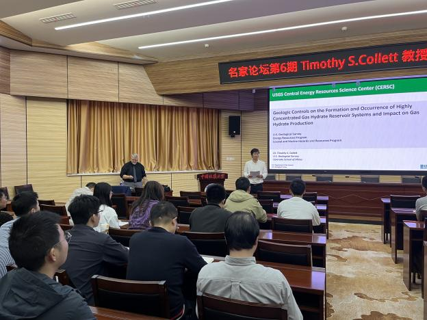 Timothy Collett教授对金年会的诚挚邀请表示衷心感谢,并作了题为“Geologic controls on the formation and occurrence of highly concentrated gas hydrate reservoir systems and impact on gas hydrate production”的精彩报告。报告详细介绍了天然气水合物基础知识,对天然气水合物油气系统勘探情况进行了详细分析,以实例的形式系统总结了美国墨西哥湾、中国南海、日本南海海槽、韩国郁陵盆地和印度KG盆地的水合物勘探和开采情况,并对美国阿拉斯加冻土区前期和当前正在开展的水合物调查及试采情况进行了分享。最后,结合其丰富的现场调查研究经验,对未来水合物产业化开发面临的关键技术难题和研究方向进行了展望,并积极鼓励与会人员就报告内容开展交流和讨论。