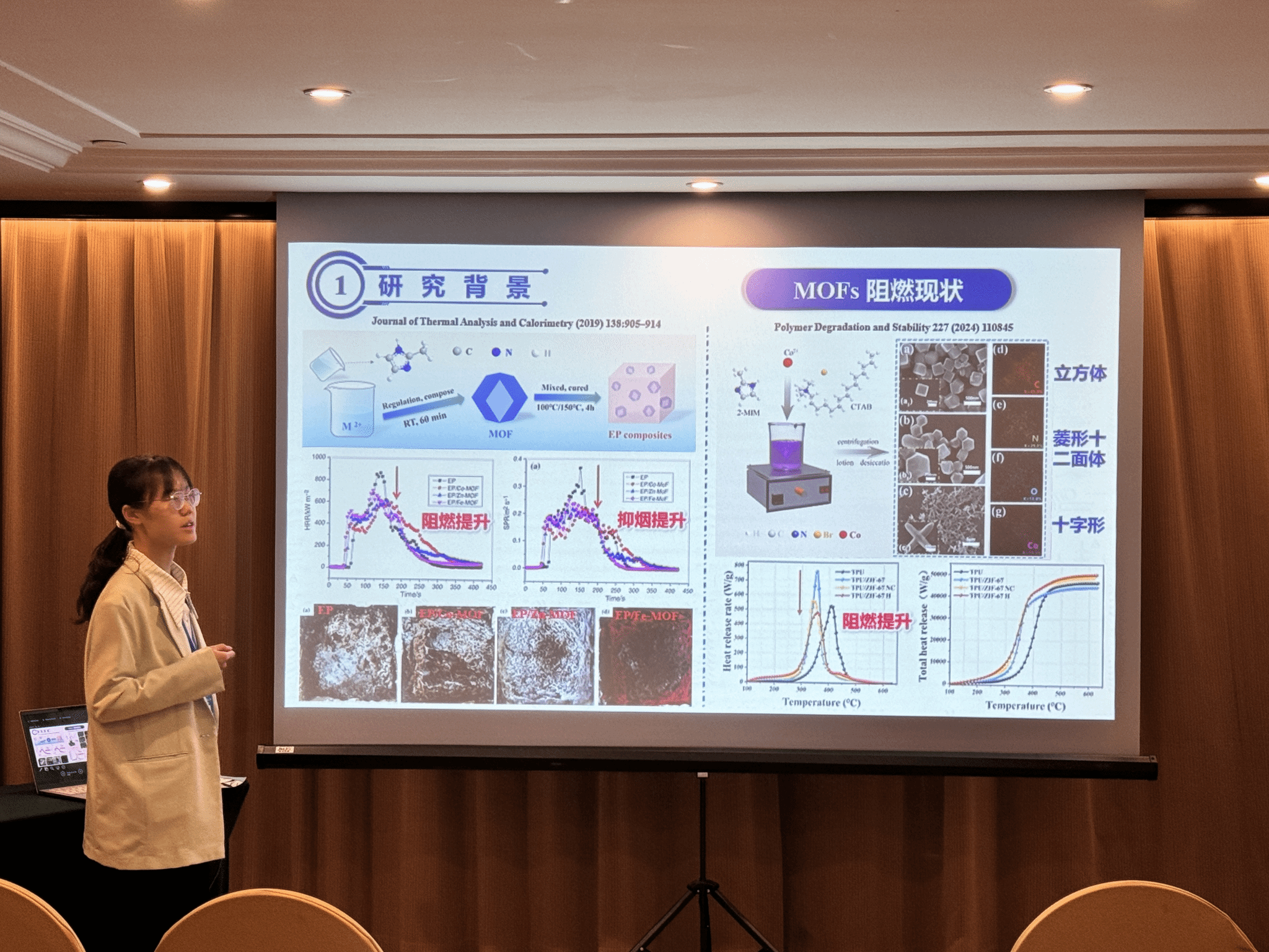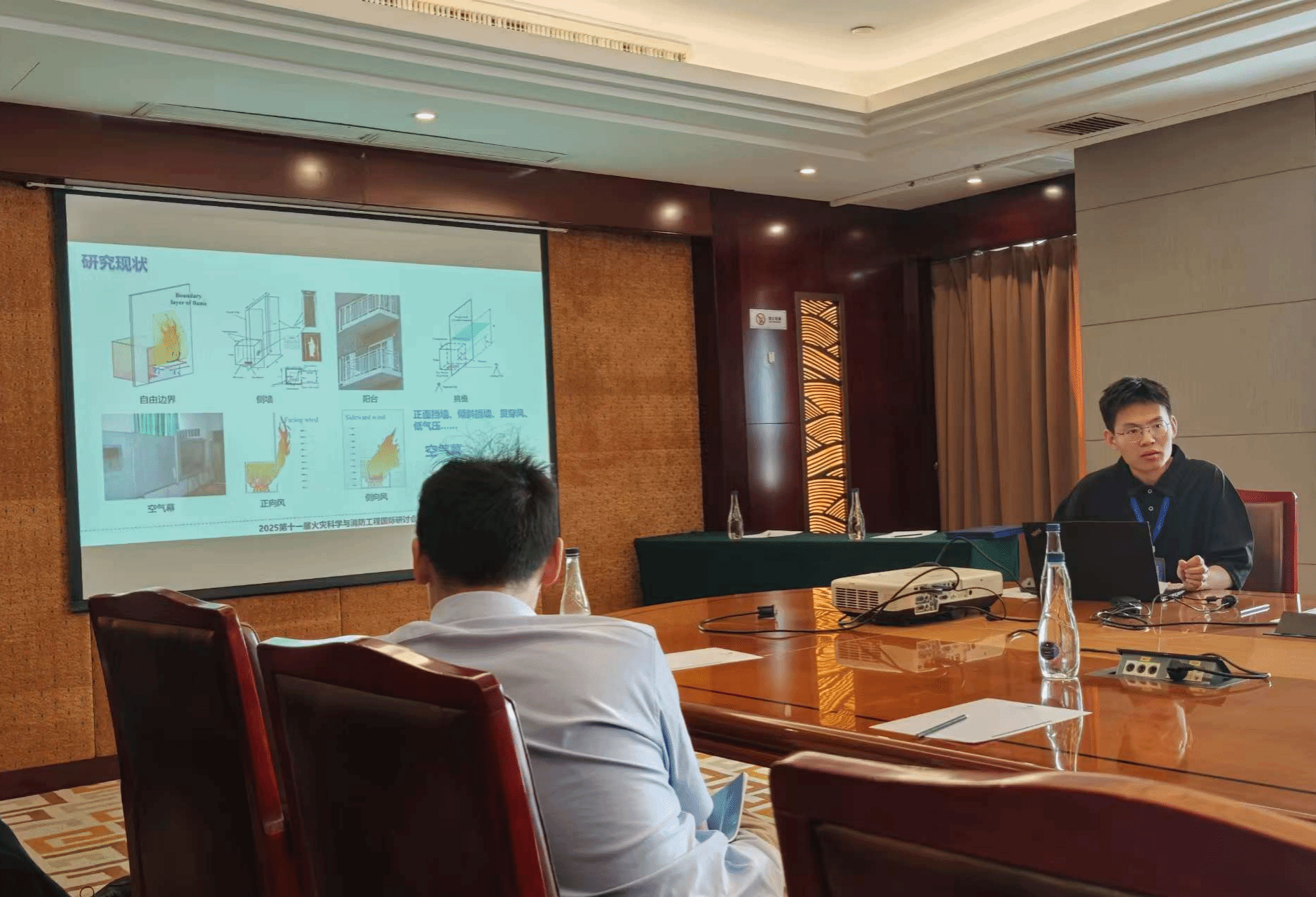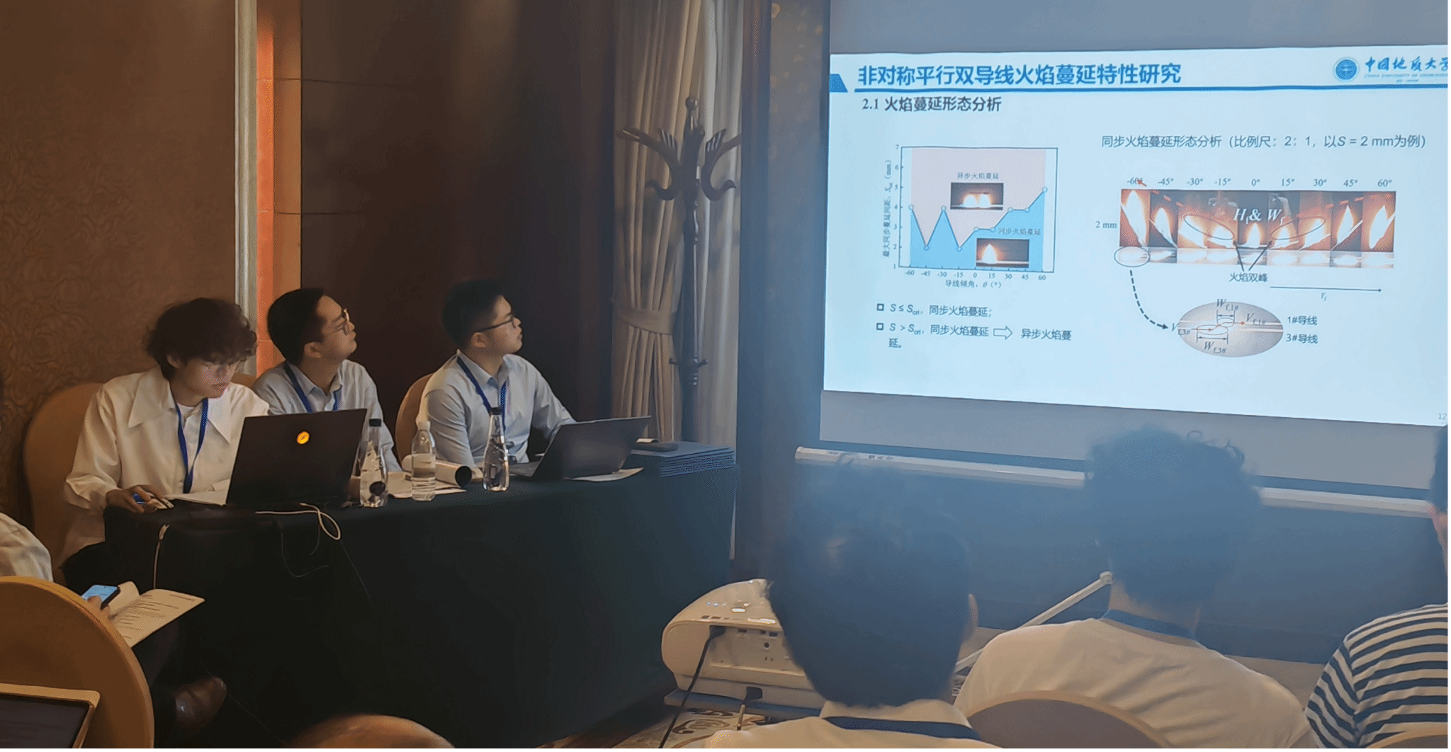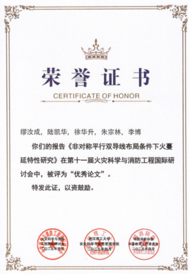 此外,金年会研究生印恋在阻燃耐火论坛作题为“卟啉基有机框架衍生物分子设计及其阻燃增韧研究”报告、罗瑊瑊在阻燃耐火论坛作题为“生物启发微中空MOFs的界面锁定效应:环氧树脂复合材料的耐火与增韧性能优化研究”报告、缪汝成在火灾机理论坛作题为“非对称平行双导线布局条件下火蔓延特性研究”报告,孟祥龙在火灾烟气论坛作题为“空气幕射流作用下的开口溢流发展行为研究”报告,宗志伟在受限空间火灾论坛作题为“墙角型壁面限制条件下的火羽流行为特性研究”报告。其中,陆凯华副教授指导的硕士研究生缪汝成获得会议优秀论文奖。