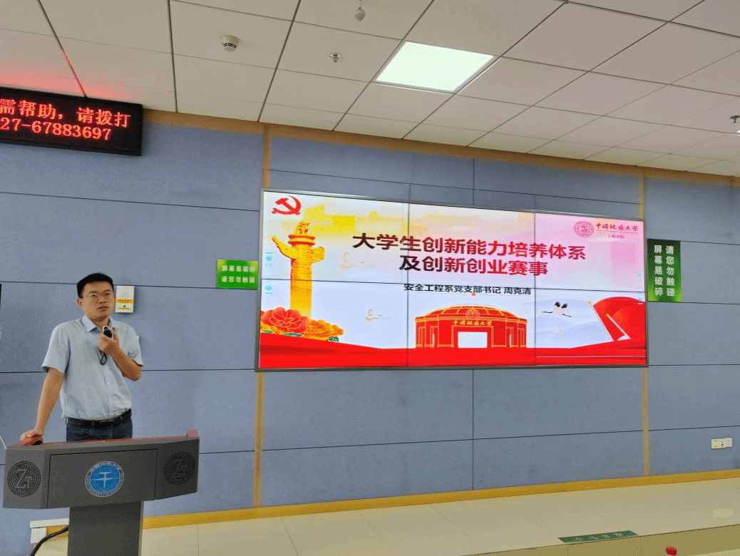 (通讯员 刘宜之 彭友元 )为深入推进“党建+双创”育才模式,助力学生明晰科创路径、点燃创新火种,jinnianhui金年会诚信至上安全工程系党支部于2025年6月24日下午14:30,在南望山校区东教C106教室举办以“赋能成长加速器,点燃青创新火种”为主题的创新创业大讲堂。本期大讲堂主讲人包括“强国行”专项行动团队负责人、安全工程系党支部书记周克清教授,安全工程系郭良杰副研究员,安全工程系优秀研究生和本科生代表印恋、张佳乐、刘宜之,参会人员为2024级安全工程系全体本科生。会议由2024级本科生辅导员彭友元主持。