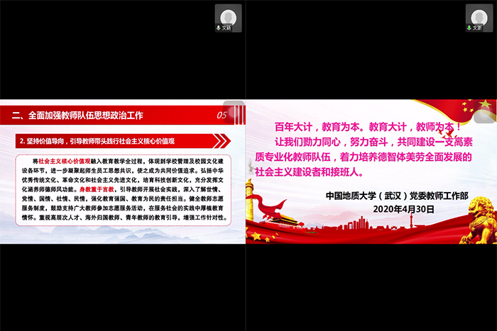 20204月29日下午,工程地质与岩土工程系党支部利用腾讯会议软件开展了主题党日活动,共有35名支部成员参加。本期主题党日活动的主题是:(1)学习“国家总体安全观”;(2)学习中共中央《关于加强和改进新时代师德师风建设》。活动由党支部副书记文新主持,副院长王亮清等工岩系全体党员参加了主题党日活动