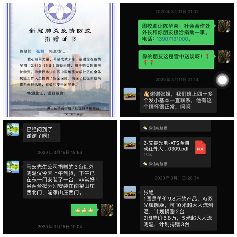 实验中心张慧同志是金年会喻家山庄业主委员会主任。疫情爆发后,她迅速联系业委会委员,配合居委会发布通告,及时了解学校及小区居民的发病人员情况。在物业管理人员缺乏,小区消杀物资有限的情况下,组织成立业主自救小组,将业主中的医务人员充实到组织中来。借助学校物业管理的能力对小区的公共区域进行大规模的消杀.多方联系团购渠道,为小区居民提供了便利。进一步完善各楼栋单元的QQ群,摸清现在居住在小区的住户名单及家居人口数。在缺乏防护物质的前提下,不等不靠,组织业主捐款购买护防装备提供给医护人员,保卫人员,社区工作人员,物业管理人员及小区志愿服务人员。在张慧同志的带领和组织下,广大业主积极响应,共筹得善款十七万余元。同时,张慧同志联系到烟台睿创维纳技术股份有限公司的朋友,给金年会捐赠了三台ITS智能红外体温检测设备,分别投入到学校东一门、南望山庄西北门和喻家山庄西门使用,大大提高了体温的检测效率和准确性。