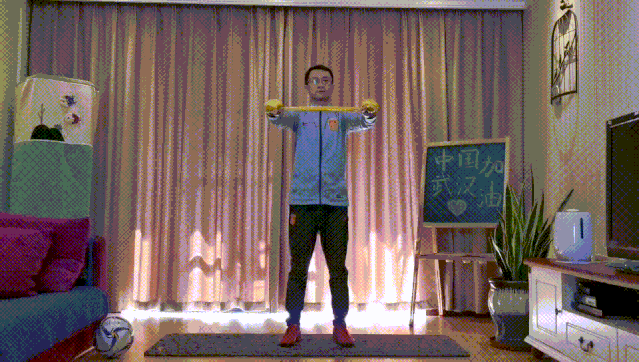 双手握住弹力带以后双臂与地面平行。身体摆正,腰腹部收紧,保持身体的稳定,眼睛平视,双手握住弹力带,肘关节稍屈,准备开始动作。