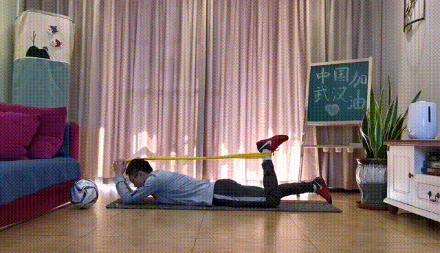 练习者俯卧在瑜伽垫上,弹力带绕过一侧踝关节,双手握住两头于顶前方。起始姿势时,练习腿膝关节呈直角,随后缓慢用力下移踝关节,做膝关节伸的动作。当踝关节接近地面时停止,并缓慢回到起始位置。