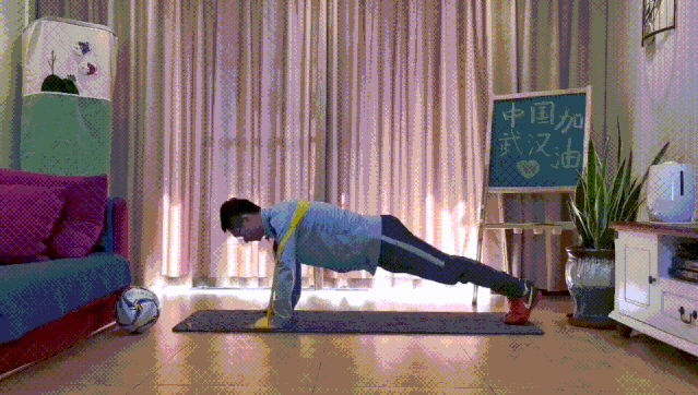 身体成俯卧撑姿势,同时将弹力带放在肩胛骨附近,双手紧握弹力带两端,这是起始位置。做俯卧撑屈臂时呼气,此时弹力带为最松程度。做俯卧撑立臂时吸气,此时弹力带为最紧程度,如此反复。
