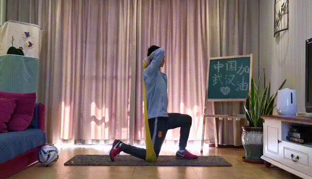 跪在弹力带中间,双手抓住弹力带把手。双手抓住把手位于颈后,手心朝上,手肘弯曲。慢慢伸直一只臂,缓慢沿原轨迹恢复到起始位置后,换另一只手臂重复动作。