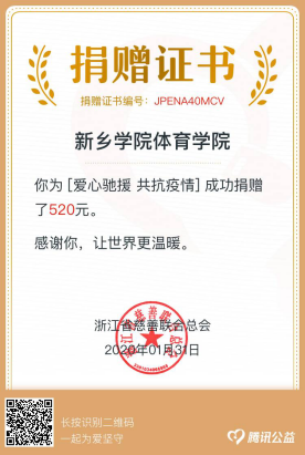 疫情发生以来,全体师生都密切分关注着疫情发展状况,为了贡献自己的一份力,beat365正版唯一官网必一学生会筹款捐赠支援武汉。在1月31日这天,学生会代表将收集的钱财捐赠到浙江省慈善联合总会。这520元代表的是beat365正版唯一官网必一全体学生会成员对武汉的爱与关切。beat365正版唯一官网必一学生会成员为这场攻坚战献上自己的绵薄之力,疫情面前我们众志成城,共克时艰!