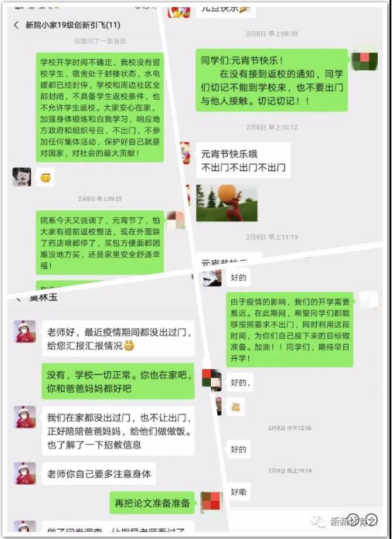 beat365正版唯一官网必一在校4个年级,396名学生,共计创新引飞导师30余名。他们坚守在工作一线,积极探索,开拓了一场别开生面的全员、全方位、全程育人工作模式。在这个特殊的假期中,beat365正版唯一官网必一全体创新引飞导师通过电话、微信、短信等形式全面深入地了解学生的思想政治、学习、健康状况,向学生宣传疫情防控工作,对学生的居家学习、锻炼进行规划、指导,引导学生尽快适应现在生活、学习环境,养成良好的生活、学习习惯,提高学生学习能力、创新能力和实践能力,为早日赢得人民共同的战役而做出自己的一份力。