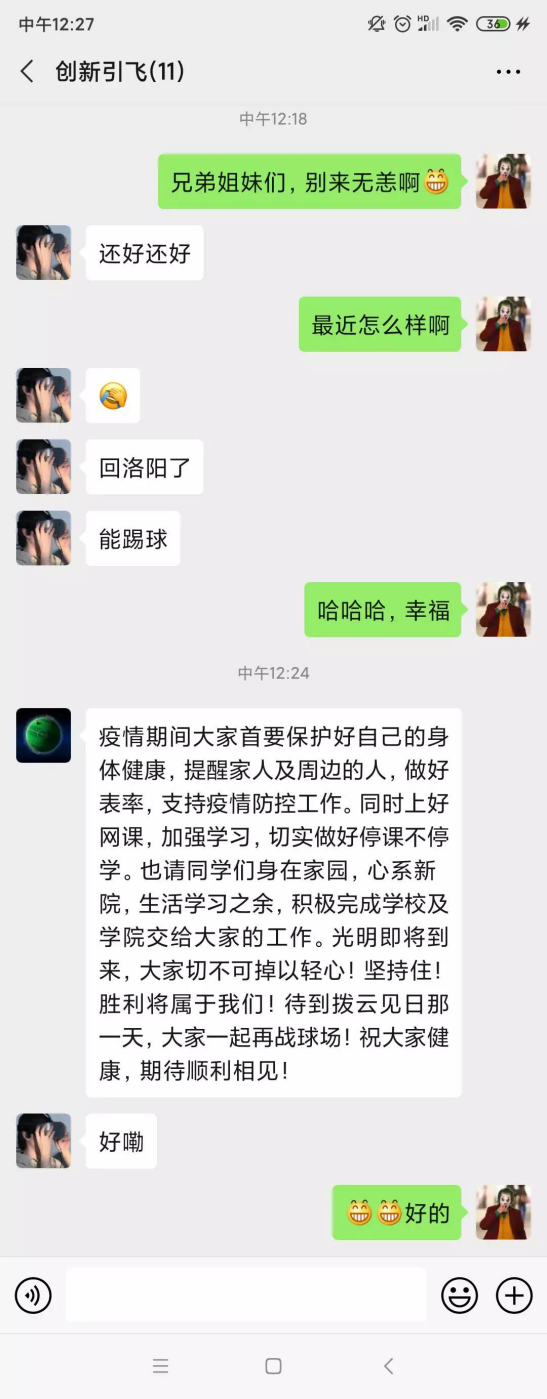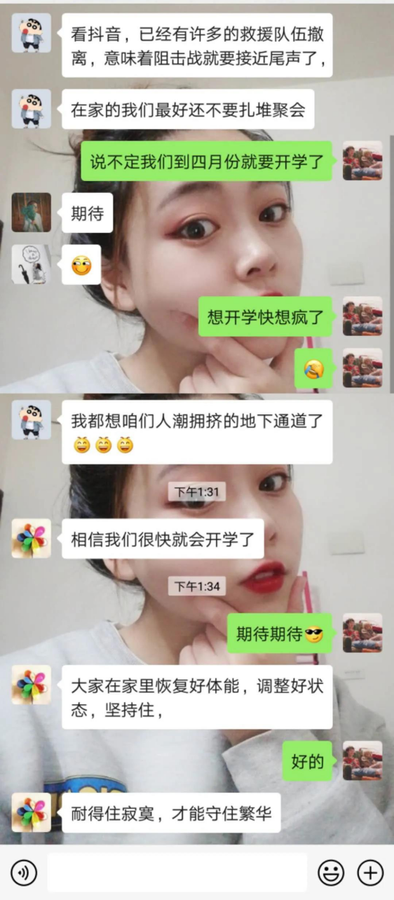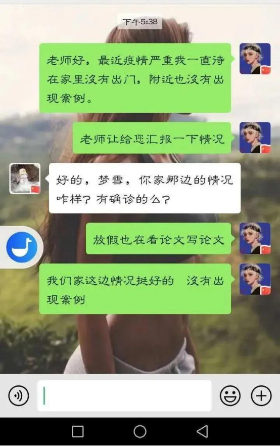 丁勇老师平时一个或者两个星期之内会联系学生一次,联系期间他会详细的问候每个同学的身体状况,叮嘱我们注意身体,还让我们提醒自己的家人及周边的人,做好表率,支持防疫工作。同时还要求我们人在家园,心系新院,积极完成学校及院系交给大家的工作。